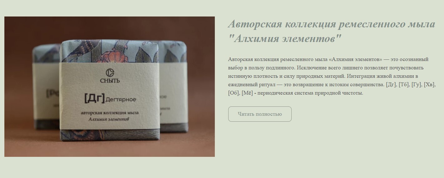 Авторская коллекция ремесленного мыла «Алхимия элементов» — это осознанный выбор в пользу подлинного. Исключение всего лишнего позволяет почувствовать истинную плотность и силу природных материй. Интеграция живой алхимии в ежедневный ритуал — это возвращение к истокам совершенства.