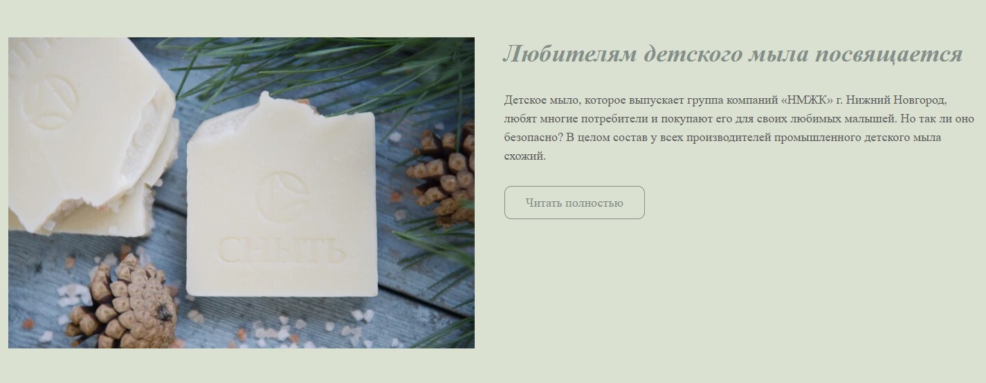 У СНЫТЬ в ассортименте всегда есть гипоаллергенное мыло из растительных масел для детей и людей, склонных к аллергии.