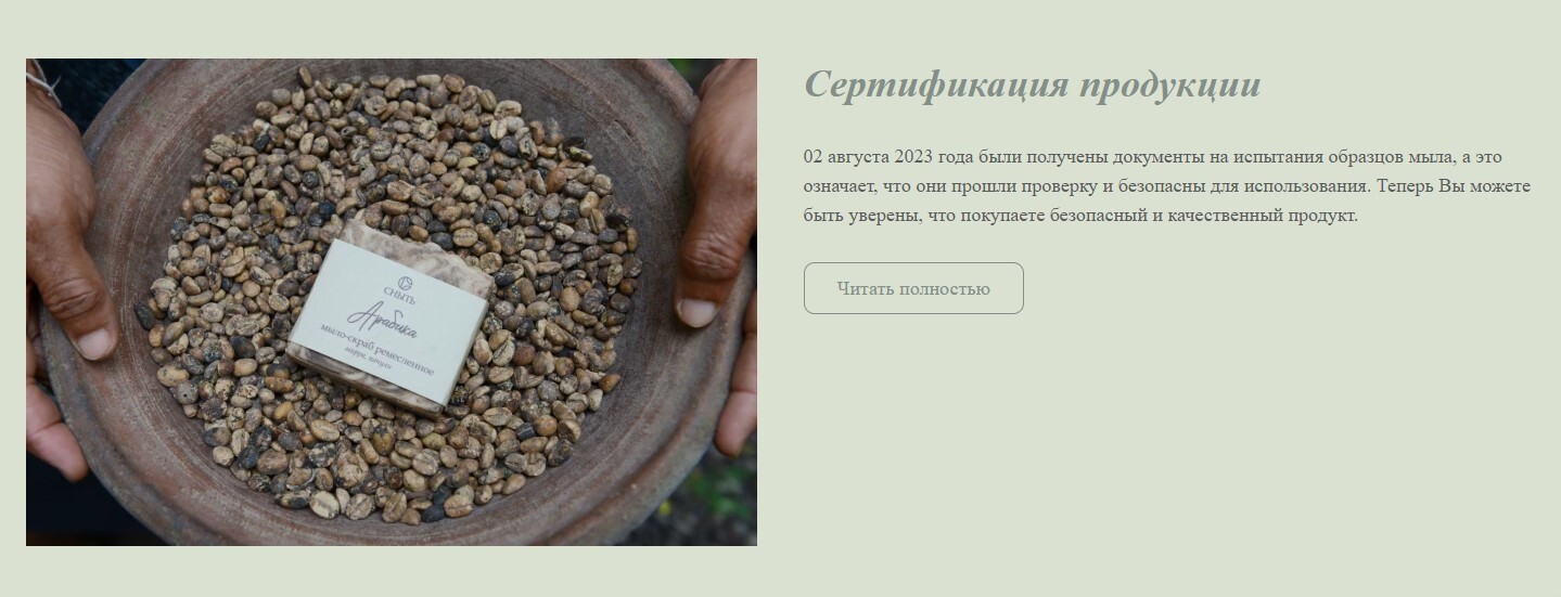 RU.РА06.В.11129/23 от 10.08.2023 г. Декларацию соответствия можно найти на сайте ФСА. Теперь Вы можете быть уверены, что покупаете безопасный и качественный продукт. Частная мыловарня СНЫТЬ приглашает к сотрудничеству магазины, банные комплексы и организации, которые хотят повысить уровень сервиса, расширить ассортимент продукции и выделиться на рынке. СНЫТЬ — это более 30 видов сертифицированного натурального мыла ручной работы.
