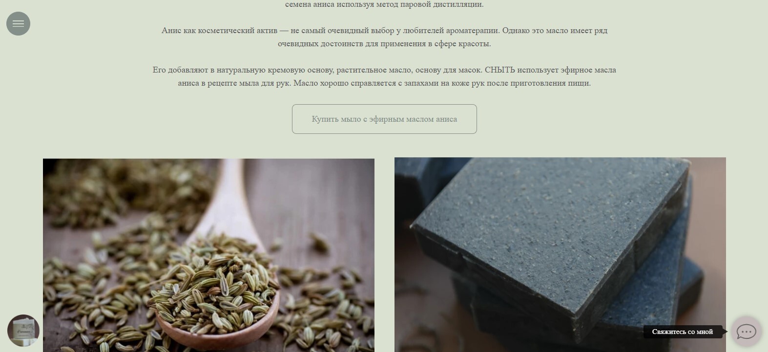 Его добавляют в натуральную кремовую основу, растительное масло, основу для масок. СНЫТЬ использует эфирное масла аниса в рецепте мыла для рук. Масло хорошо справляется с запахами на коже рук после приготовления пищи.