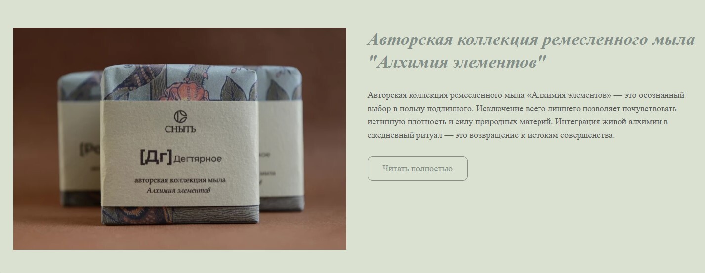 Авторская коллекция ремесленного мыла «Алхимия элементов» — это осознанный выбор в пользу подлинного. Исключение всего лишнего позволяет почувствовать истинную плотность и силу природных материй. Интеграция живой алхимии в ежедневный ритуал — это возвращение к истокам совершенства.