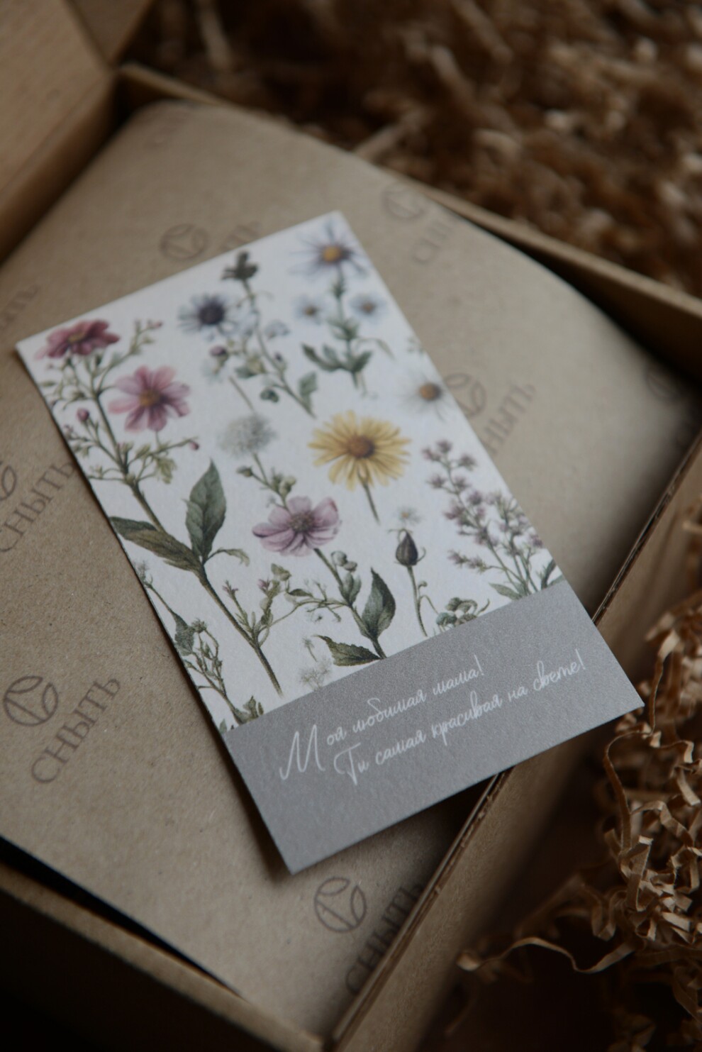 Большой подарочный набор-открытка с ботанической картинкой порадует каждую маму.